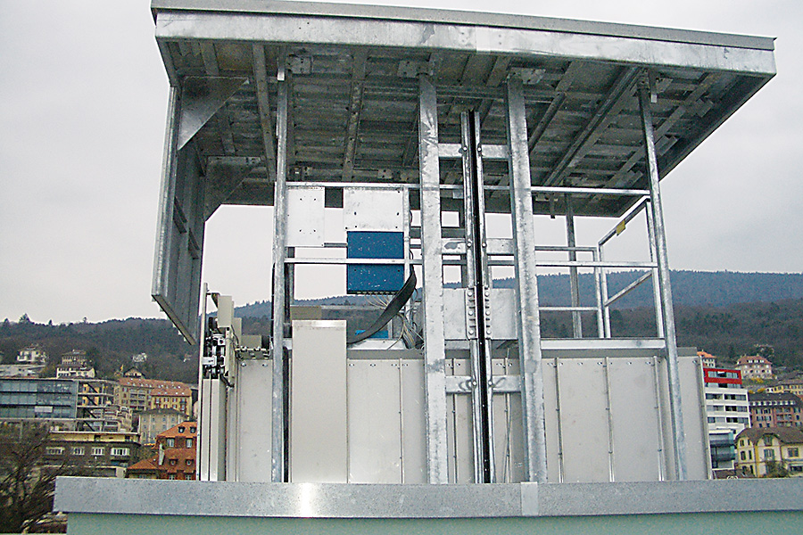Unsere fleißige Ameise, speziell für Einbausituationen, in denen in der obersten Haltestelle kein Schacht vorhanden ist – oder sein darf. Der Schacht weist auf der Höhe des Fußbodenniveaus der obersten Haltestelle eine Schachtabdeckung (Baldachin) auf, welche bei der Fahrt nach oben angehoben wird.